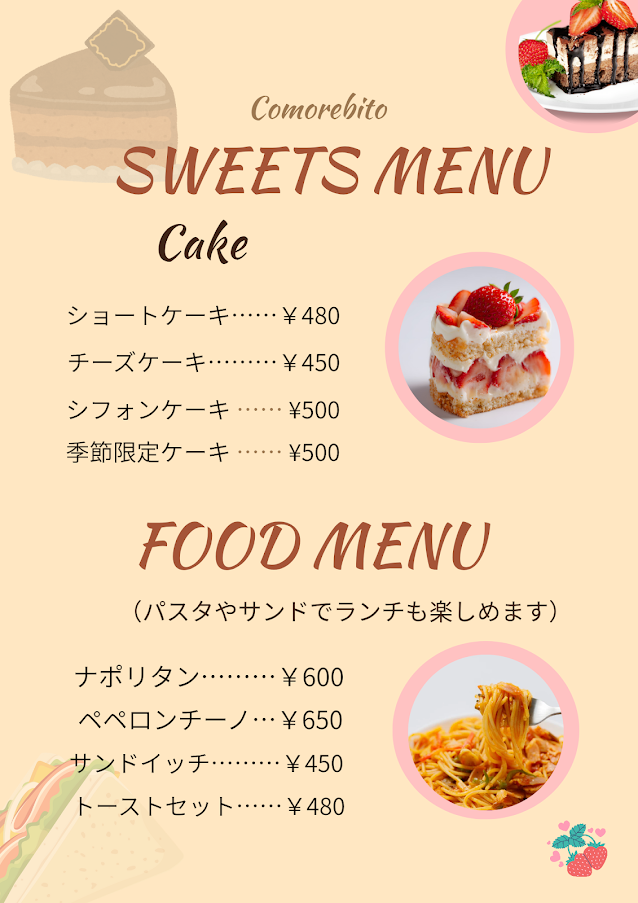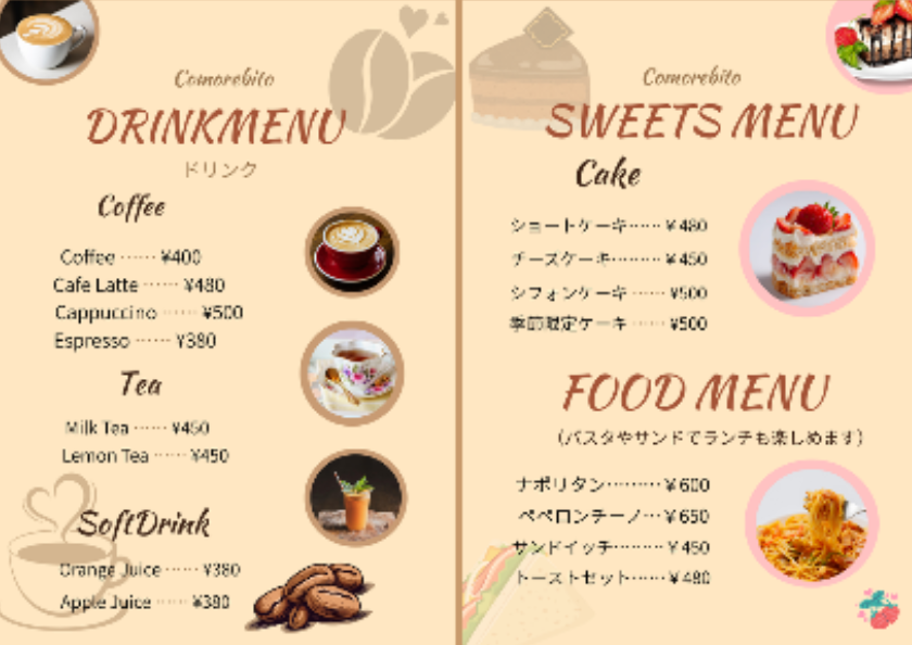 Cafe Comorebitoのオリジナルメニューをデザインしました。