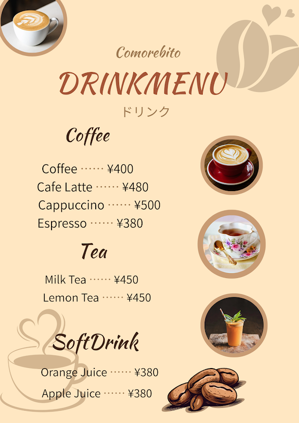 温かみのある色合いと手書き風のフォントを組み合わせ、カフェの落ち着いた雰囲気や居心地の良さを表現しています。
